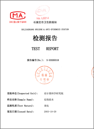 檢驗(yàn)報(bào)告 “石家莊衛(wèi)生防疫站浸泡后水”
