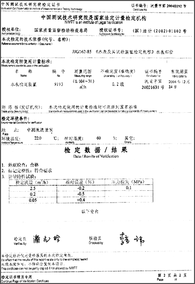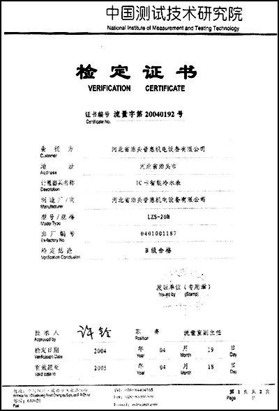 中國(guó)測(cè)試機(jī)術(shù)研究院檢定證書“IC卡智能冷水表 20040192號(hào)”