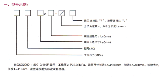 矩形波紋補償器型號: 本廠生產DN1000-DN5000,壓力級別0.01-0.25Mpa;矩形波紋補償器字母代號PJX,也可簡單寫為JX。矩形波紋補償器型號書寫示例:0.02JX*2000*800-2/410F。0.02表示工作壓力,端面尺寸長邊2000mm,短邊800mm,波數(shù)為2,高度410mm,F(xiàn)法蘭連接。