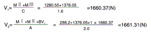 | b、G1點(diǎn): Fx=-V1=-1660.37N Fy=Fz=0 Mx=My=Mz=0 D1點(diǎn): Fx=Fz=0,Mx=My=0 Fy=V2=1661.31N M2=-MⅡ+V2×L′-V1(20-B-C) =-1280.55+1661.31×2-1660.37(20-1.0-1.6) =-26848.37(N·m) D2點(diǎn): Fx=Fz=0,Mx=My=0 Fy=-V2=-1661.31(N) Mz=MⅠ-Fy(2+LⅠ/2)=286.2+1661.31(2+0.8/2)=4273.34(Nm) 受力圖: |