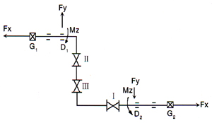 | 所以沿工作位移相反方向進(jìn)行冷緊安裝(冷緊量δ=74.04mm) 4、鉸鏈波紋補(bǔ)償器計算支座承受載荷: 下面分析固定支座G1、G2和導(dǎo)向支架D1、D2的受力情況。 a、膨脹節(jié)變形力矩。 |